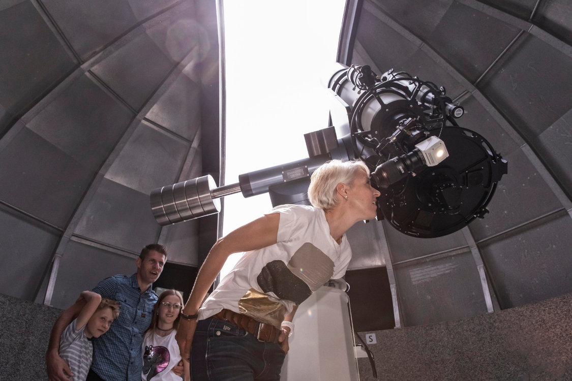 Zusammen wird der aktuelle Sternenhimmel betrachtet, Galaxien und Sternbilder erspäht. Auch für bedeckten Himmel oder Regen ist vorgesorgt: In der Planetariums-Kuppel kann durch modernste Technik der aktuelle Sternenhimmel auf eine 360°-Leinwand projiziert werden.
